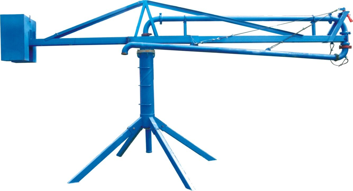 結(jié)構(gòu):、插銷、立架、構(gòu)成的底座是固定部分,其上通過回轉(zhuǎn)支承與上部回轉(zhuǎn)部分相連,上主梁架、平衡臂、平衡臂架拉桿、上橫桿組成后回轉(zhuǎn)部分。立管上有回轉(zhuǎn)卡篐接頭。通過人力拉動,可使整個回轉(zhuǎn)部分回轉(zhuǎn)360度。上梁主架前端連接有一個回轉(zhuǎn)支座與前橫桿、前拉桿組成前回轉(zhuǎn)部分,在人力拉動下可繞回轉(zhuǎn)支座旋轉(zhuǎn)300度。由兩部分回轉(zhuǎn)架組成的合成運動就能覆蓋所有布料半徑范圍的布料點。