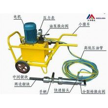 公路、鐵路修建遇巖石、城市、村寨需開挖房基遇巖石等狀況,石方很大的情況下,每個工作點可選用如下設(shè)備:鑿巖機3~4臺(配空壓機),液壓分裂機一臺(配2~3把劈裂頭),挖掘機一臺(配破碎錘)。具體操作如下:先將巖石上的泥土清理干凈,而根據(jù)巖石的紋理,在巖石上用鑿巖機鉆一組孔,每組孔以配劈裂頭的數(shù)量而定,孔距可根據(jù)不同巖石而定,一般在80cm~120cm左右,鉆好一組孔后立即將這組孔的巖石劈裂開,看劈裂的情況以便確定下一組孔的位置及方向。液壓分裂機有一個很重要的特性就是所劈裂體的劈裂位置要處于在兩邊對等相抗的位置上,不能一邊太薄而走漂。這樣劈裂的效果就不太明顯。一般情況下,所打的孔臨空面1米至1.5米就可以。劈裂深度亦視巖石的狀況而定,整體性越好劈裂深度就越深,可達2~3米。因液壓分裂機只能把巖石劈裂而不能將劈裂的石塊移出,而挖掘機的破碎錘又很難將山體上的巖石破碎,但液壓分裂機劈裂開的石塊又能輕而易舉將其移出,再將大塊的巖石破碎,易于裝卸。所以液壓分裂機與破碎錘配合使用既安全、效率又高。
