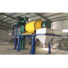 立式膩子粉攪拌機,采用的圓筒豎放的形式,中間穿插攪龍,軸承在圓筒下方,連接固定攪拌電機,配有上料提升機。物料采用攪龍將中間物料攪拌上拋的形式來達到混合均勻的效果。