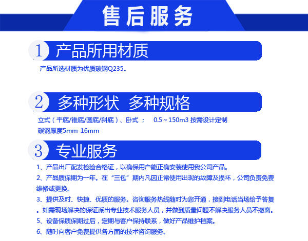 我們公司并可根據(jù)客戶要求制作來圖來料加工防腐儲罐。工程質(zhì)量達(dá)到經(jīng)濟(jì)、合理、可靠、可信和優(yōu)良的標(biāo)準(zhǔn)。讓您滿意是我們的追求。為您服務(wù)是我們的職責(zé)。“質(zhì)量是企業(yè)生存的命脈 ;信譽(yù)是廠家發(fā)展的階梯?!?讓利客戶、規(guī)格生產(chǎn)、成本降低、統(tǒng)一銷售。歡迎廣大客戶來函、來電、來樣咨詢訂購,讓您買的放心用得安心,與您攜手共創(chuàng)輝煌。