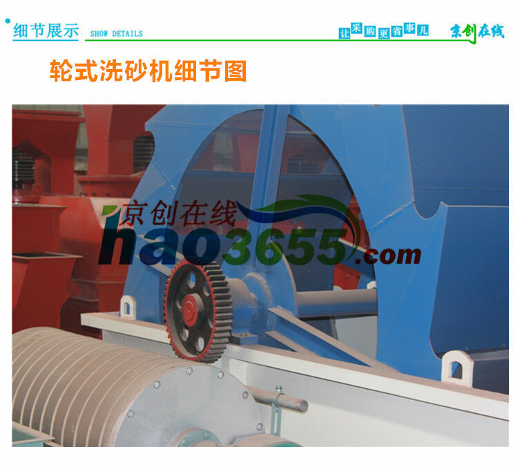 工作時,電機(jī)通過三角帶、減速機(jī)、齒輪減速后帶動葉輪緩慢轉(zhuǎn)動,砂石有給料槽進(jìn)入洗槽中,在葉輪的帶動下翻滾,并互相研磨,除去覆蓋砂石表面的雜質(zhì),同時破壞包覆砂粒的水汽層,以利于脫水;同時加水,形成強(qiáng)大水流,及時將雜質(zhì)及比重小的異物帶走,并從溢出口洗槽排出,完成清洗作用。干凈的砂石由葉片帶走,最后砂石從旋轉(zhuǎn)的葉輪倒入出料槽,完成砂石的清洗作用。