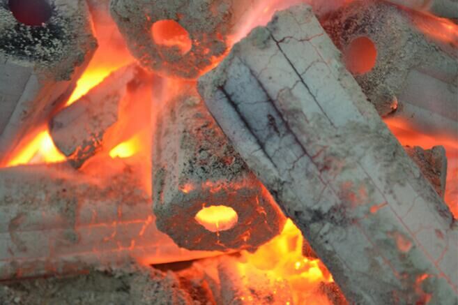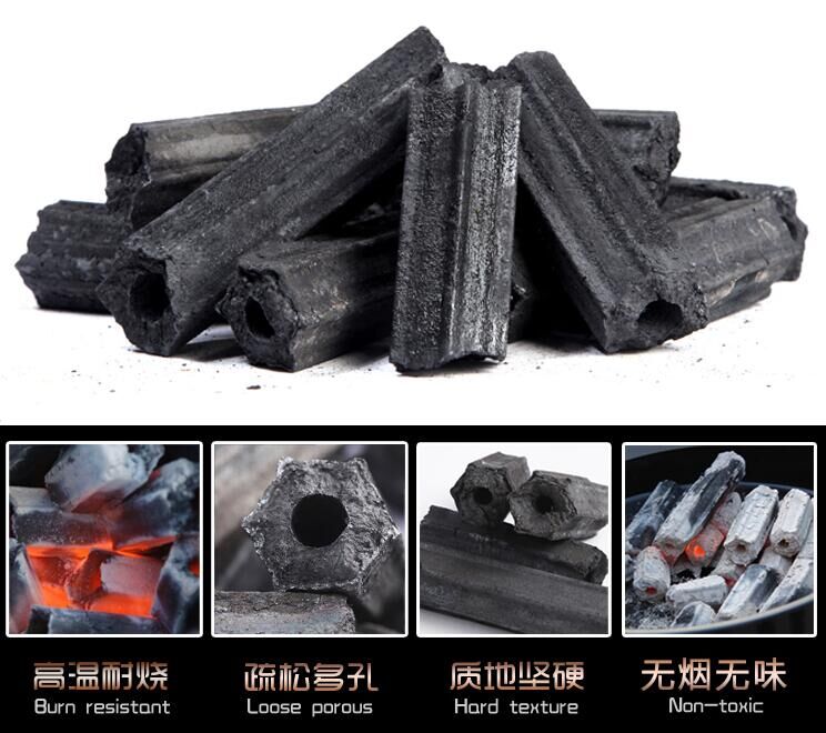 易燃速燃碳,無毒易燃碳呈壓制成中空的六棱形,從碳灰上就看出來含有煤的成份。一般常用汽油,助燃劑等其他方式點燃。