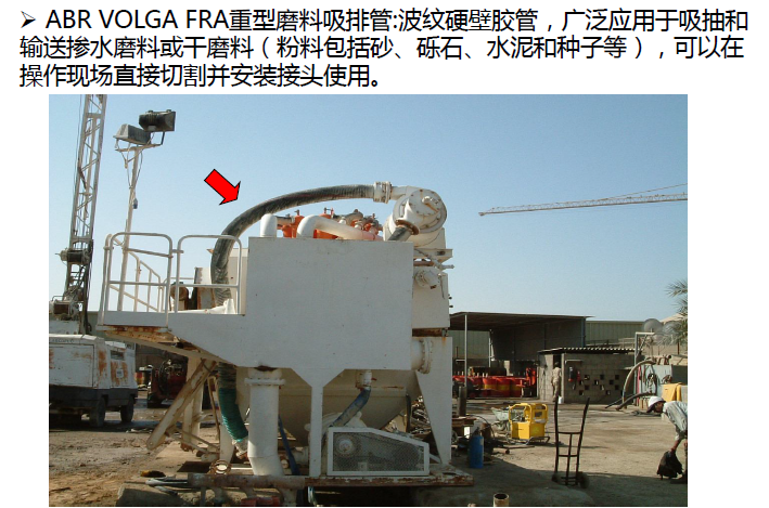 應(yīng)用范圍: 波紋硬壁膠管,廣泛用于吸抽和輸送摻水磨料或者只是粉 塵(砂,礫石,水泥,種子等), 可以在操作現(xiàn)場(chǎng)直接切割并安裝 接頭使用