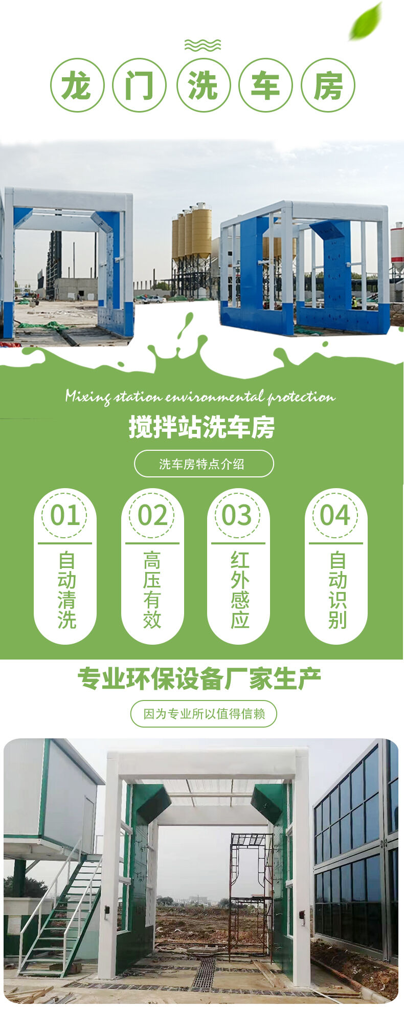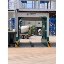 針對混凝土攪拌站研發(fā)的固定式工程車輛洗車房,其主要作用是清洗攪拌罐車進料口、車輪、底盤及車身,通過高壓噴頭沖洗可以有效去除清洗部位的泥土灰塵以及未凝固的水泥漿,避免了攪拌車身殘留混凝土四處散落對環(huán)境的 影響。