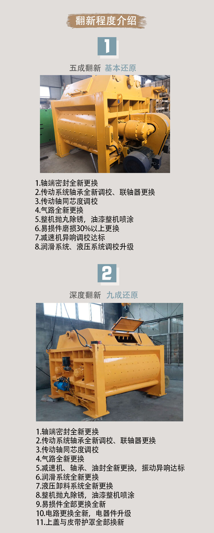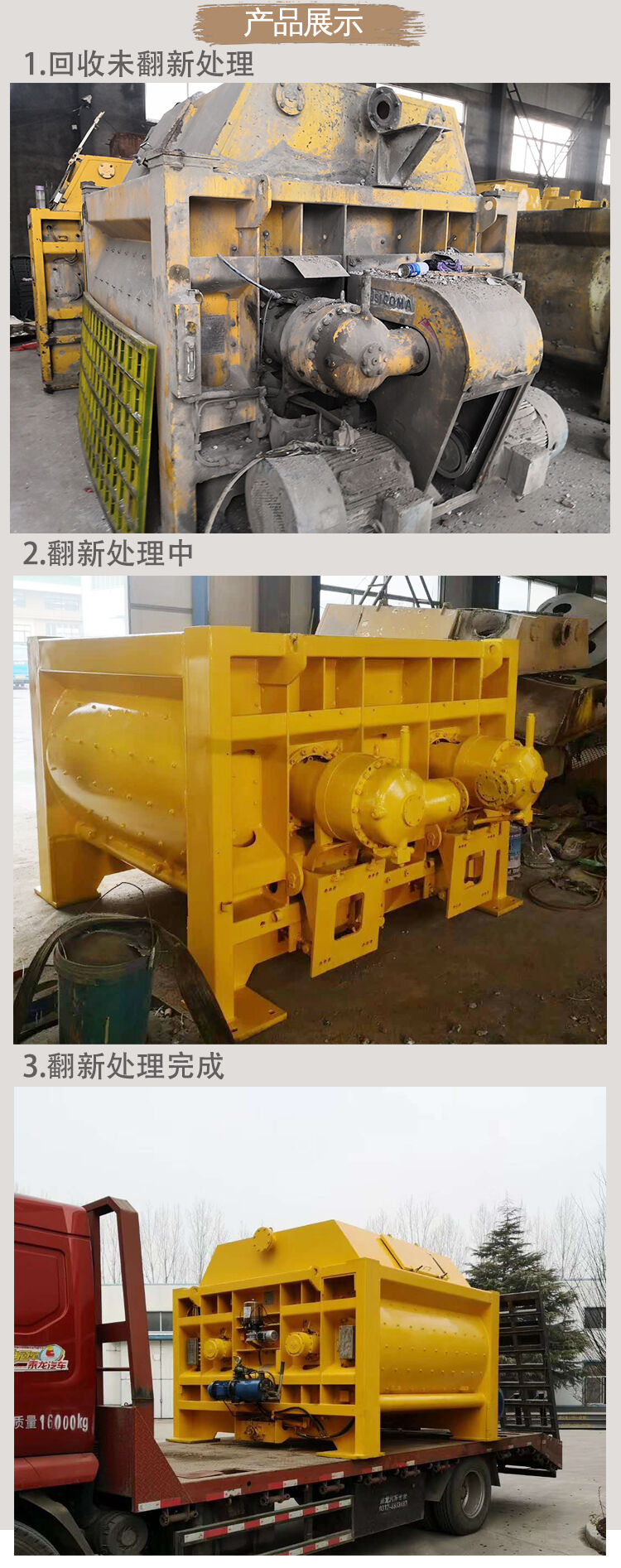 隨著國家基礎(chǔ)建設(shè)的大力推進,攪拌站轉(zhuǎn)場的速度也在加快,有些攪拌機使用2-3年就被閑置,未能發(fā)揮出他的最優(yōu)性能。一些攪拌機的主要部件性能任然很好。為了將這一部分設(shè)備重新利用,我公司擁有專業(yè)的人員、評估、回收、檢修、然后再以嶄新的面貌服務客戶。