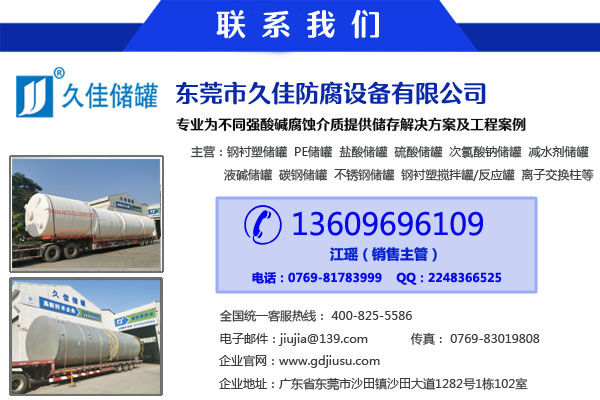 找質(zhì)量上乘、服務一流的鋼襯塑樹脂罐攪拌罐供應商,選東莞市久佳防腐設備有限公司,公司是華南地區(qū)知名的防腐鋼襯塑攪拌罐生產(chǎn)廠家,引進國外先進的技術(shù)設備以及滾塑工藝,品質(zhì)保證。生產(chǎn)的防腐攪拌罐、鋼襯塑儲罐具有無焊接縫、不滲漏、耐腐蝕,抗老化,抗沖擊,表面光滑結(jié)合力強。對一般酸堿鹽的有機溶劑性能良好,適用于腐蝕性氣體,液體及固體液,漿液介質(zhì)的攪拌以及儲存輸送。