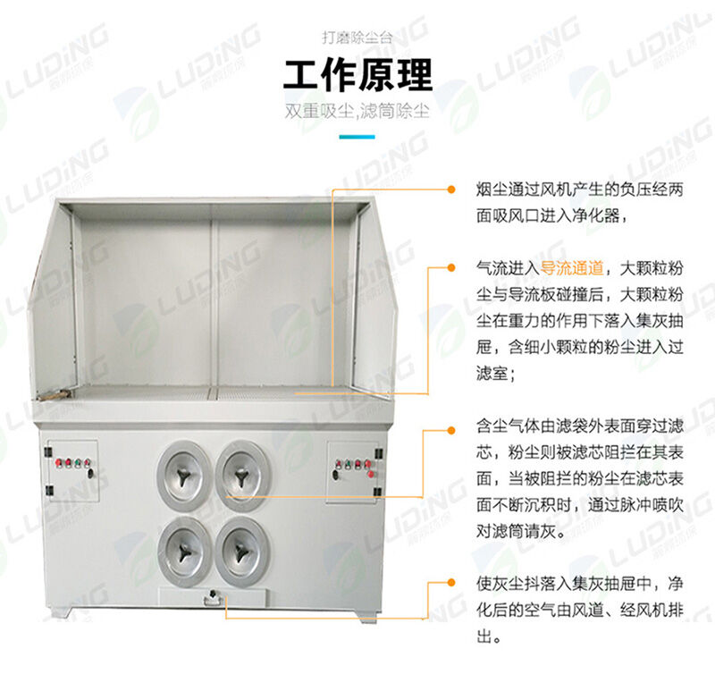 大功率型除塵工作臺,特別適用于打磨大型工件場所使用。工作臺臺面氣流均衡,無低氣流死角。工作臺設(shè)計(jì)有獨(dú)立的電氣控制系統(tǒng),提供氣動、清灰、報(bào)警等多種功能,保證設(shè)備處于較佳工作狀態(tài)。打磨工作臺凈化率99.6