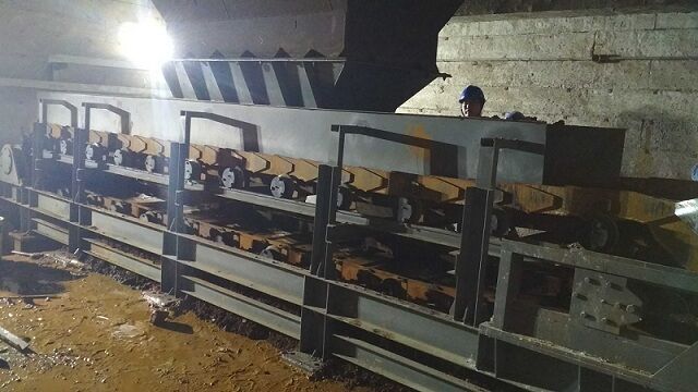 3)第三種方法是將刮板輸送機固定在板式給料機下面的水泥基礎(chǔ)溝槽內(nèi),漏料通過漏斗進(jìn)入刮板輸送機內(nèi)。