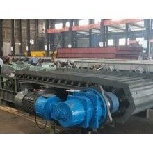通過分析研究上述問題,結(jié)合國內(nèi)外給料機使用情況,重新設計制作了一臺新型給料機,主要特點是:采用板式給料機連續(xù)給料;板式給料機料板采用雙圓弧、節(jié)點重合的方式,解決了漏料問題;板式給料機安裝角度為18°,可使物料緩慢分散跌落到皮帶機上;撥料棍采用逆物料方向旋轉(zhuǎn),以控制物料層的厚度;料斗設計采用漸開式,解決了膨料問題;電機采用變頻控制,可控制出料速度。經(jīng)過三個多月的的現(xiàn)場使用,證明能夠完成勻料,效果較好。