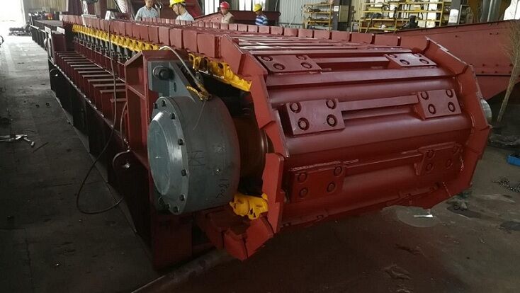 鏈板組件直接承受礦倉(cāng)物料壓力和運(yùn)送物料。鏈板組件由輸送板、牽引鏈軌及其聯(lián)接螺栓組成。輸送板采用搭接式結(jié)構(gòu)。輸送板材質(zhì)為高錳鋼,鑄造成型,相互搭接,輸送板用螺栓固定在鏈軌上。這種板不僅重量輕、不漏礦,而且強(qiáng)度高、耐磨損、抗沖擊。