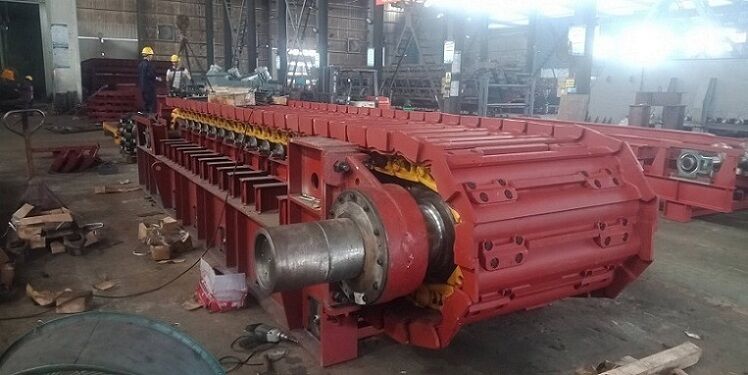 座部件由機(jī)架和支承件組成。機(jī)架由鋼材焊接而成,支承部件有支重輪、下托輪和縱向?qū)к?,輸送板得到支重輪和縱向?qū)к壍碾p重支持,使支重更均勻合理。牽引鏈基本上不受礦石和自重產(chǎn)生的張力作用,支重輪外側(cè)設(shè)計(jì)有凸臺(tái),與主、從動(dòng)輪聯(lián)合作用,成功地杜絕鏈軌跑偏。在機(jī)架下方設(shè)有下托輪,為方便維修,下托輪為側(cè)裝式。