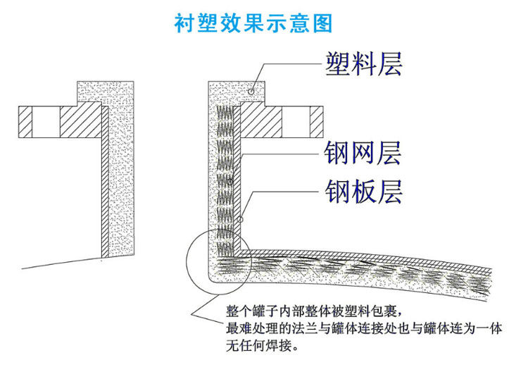 鋼襯塑聚乙烯儲罐:以純聚乙烯(PE)為原料,使用熱融滾塑工藝將聚乙烯內(nèi)襯于鋼罐體內(nèi)壁,鋼罐體內(nèi)網(wǎng)(龜甲)與聚乙烯有機(jī)結(jié)合成一體,使聚乙烯牢固過渡連接鋼體內(nèi)表面,內(nèi)襯聚乙烯防腐層厚度可根據(jù)實際需要而定,內(nèi)襯聚乙烯防腐層厚度可在15-25mm不等。