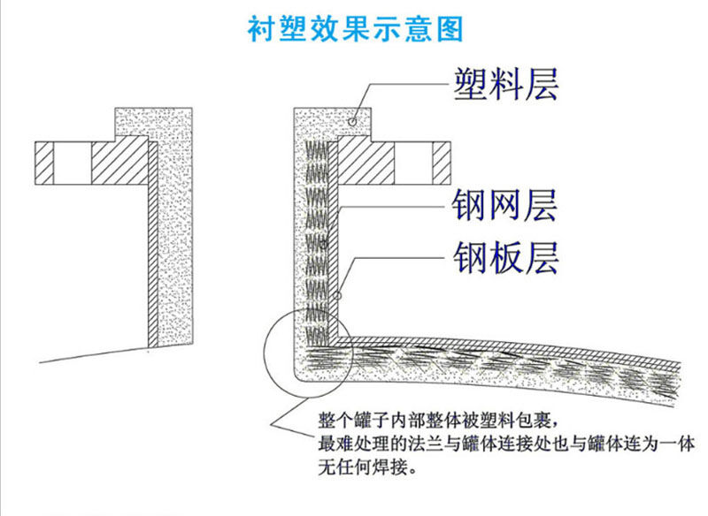 鋼襯塑產(chǎn)品一般由桶身、平底、封頂、人孔、進料口法蘭、出料口法蘭和液位孔口法蘭組成,臥室鋼襯塑儲罐通常還有標準鋼質(zhì)支座,鋼襯塑產(chǎn)品一般根據(jù)用戶要求設(shè)計制造。