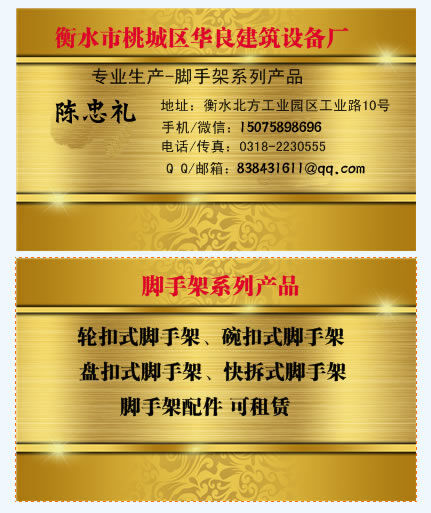 河北衡水華良建筑設(shè)備廠是一家專業(yè)的腳手架、輪扣腳手架、碗扣腳手架、腳手架配件等產(chǎn)品的腳手架生產(chǎn)廠家,公司積累了多年的腳手架技術(shù)經(jīng)驗(yàn),真誠(chéng)歡迎新老客戶來(lái)電咨詢:150-7589-8696