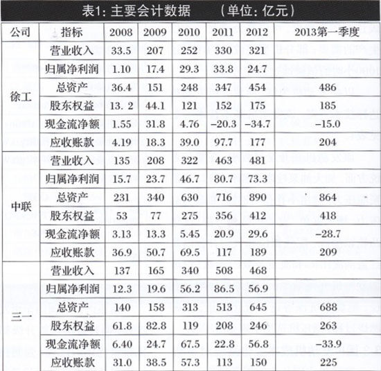 分析表3中數(shù)據(jù),參考近年三駕馬車資金投向,隱含在數(shù)據(jù)后面的一個事實(shí)就浮出水面:經(jīng)過幾年布局,各有斬獲后,出于做大做強(qiáng)企業(yè),保優(yōu)勢、補(bǔ)短板需要,挖掘機(jī)市場將是徐工、中聯(lián)的發(fā)力點(diǎn);徐工還將全面進(jìn)入混凝土機(jī)械市場,2012年報顯示,其占比首次達(dá)到12%;三一則必然會在起重機(jī)市場加在投入,另外其路面機(jī)械也對徐工形成沖擊態(tài)勢。作為行業(yè)領(lǐng)跑者,三駕馬車都在投巨資、博市場,期待追平或拉開與對手的距離。這就是三駕馬車現(xiàn)金流量表中,投資活動現(xiàn)金流量長期負(fù)數(shù)的主要原因。