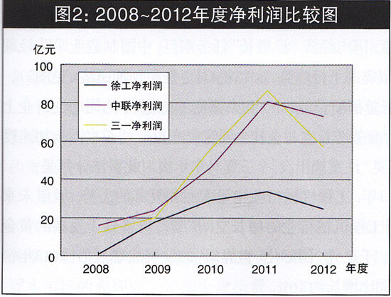 分析工程機(jī)械上市公司三駕馬車5年主要會計數(shù)據(jù)表明(見表1):中聯(lián)連續(xù)5年實(shí)現(xiàn)營業(yè)收入增長,徐工、三—在實(shí)現(xiàn)4年營業(yè)收入連續(xù)增長后,2012年營業(yè)收入出現(xiàn)負(fù)增長。從表1可知,三家上市公司凈利潤指標(biāo),均在實(shí)現(xiàn)連續(xù)4年上漲后,于2012年同時出現(xiàn)負(fù)增長。從圖1、圖2可見三駕馬車2008年、2012年營業(yè)收入、凈利潤排名一致,分別是中聯(lián)、三一、徐工,而在五年中的2009、2010、2011三年,以上排名互有消長。比較主營業(yè)務(wù)十分接近的兩家上市公司三一和中聯(lián),我們發(fā)現(xiàn):在五年之中,當(dāng)GDP增長率走高時,三一的主營業(yè)務(wù)收入增長率、凈利潤增長率高于中聯(lián),在經(jīng)濟(jì)下行壓力增大,GDP增長率走低時,中聯(lián)的收入增長,具有相對穩(wěn)定性(見圖1)。