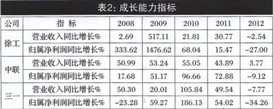 公司的成長與盈利能力正相關(guān)。在年報中,主營業(yè)務(wù)收入增長率、凈利潤增長率、凈資產(chǎn)增長率以及凈資產(chǎn)收益率、毛利率、凈利率等財務(wù)指標(biāo),是判斷企業(yè)成長性和盈利能力的重要指標(biāo)。表2顯示,三駕馬車中,5年主營業(yè)務(wù)收入同比增長率實(shí)現(xiàn)連續(xù)5年正增長、連續(xù)三年保持30%以上增長率的公司是中聯(lián),五年中增長率振幅最大的公司是徐工,2012年徐工和三—主營業(yè)務(wù)收入增長率均出現(xiàn)負(fù)增長;表2還顯示,凈利潤同比增長率方面,沒有—家公司連續(xù)五年正增長,2012年三駕馬車同時出現(xiàn)負(fù)增長,三一錄得-34.26%的最大降幅。在大環(huán)境不利因素作用下,公司成長性受到嚴(yán)峻挑戰(zhàn)(見圖2)。