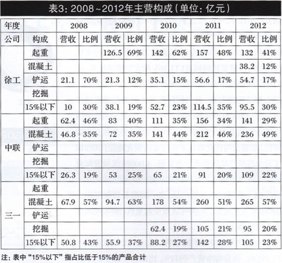 分析表3數(shù)據(jù),2012年營業(yè)收入超100億元的產(chǎn)品:徐工是起重機(jī),營收132億元、占到營業(yè)總收入4l%,其中占營業(yè)收入15%以上的產(chǎn)品還有鏟運(yùn)機(jī)械,占比17%、營收54.7億元;中聯(lián)有兩個營收超百億元產(chǎn)品,分別是營收236億元的混凝土機(jī)械和141億元的起重機(jī)械。占比分別是46%和34%,二者合計占比80%;三一近似有兩個超百億元產(chǎn)品,一個是營收265億元的混凝土機(jī)械和約百億元營收95億元的挖掘機(jī)械,分別占比57%和20%,二者合計占比77%?;赝?008年,三駕馬車沒有一個產(chǎn)品營收超百億元,其占比15%以上的產(chǎn)品:徐工是鏟運(yùn)機(jī)械,營收21.1億元、占比70%;中聯(lián)是起重機(jī)械、混凝土機(jī)械,占比分別是46%、35%,二者合計占比81%;三一是混凝土機(jī)械,占比57%。細(xì)分產(chǎn)品構(gòu)成,徐工的起重機(jī)主要以移動式起重機(jī)為主,在行業(yè)處于龍頭地位;中聯(lián)的起重機(jī)包含移動和塔式兩塊,其中塔式起重機(jī)是行業(yè)龍頭;在占比小于15%的部分,徐工有混凝土機(jī)械、壓實(shí)機(jī)械、路面機(jī)械等,中聯(lián)有土方機(jī)械、路面及樁工機(jī)械、環(huán)衛(wèi)機(jī)械等,三一有起重機(jī)械、路面及樁工機(jī)械等。