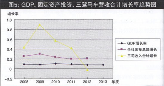 周期性行業(yè)受周期制約的特點(diǎn),決定周期性行業(yè)要避免誤判宏觀經(jīng)濟(jì)發(fā)展趨勢,才能健康發(fā)展。5年來,三駕馬車—直在擴(kuò)張產(chǎn)能,在經(jīng)濟(jì)下行壓力加大、GDP增長率持續(xù)回落的宏觀背景下,主要財務(wù)指標(biāo)必然加速度回落(見圖4)。面對如此局面,要保持增長勢頭,就必須準(zhǔn)確判斷宏觀經(jīng)濟(jì)趨勢,調(diào)整企業(yè)發(fā)展戰(zhàn)略。三駕馬車,是如何判斷宏觀經(jīng)濟(jì)發(fā)展趨勢的呢?