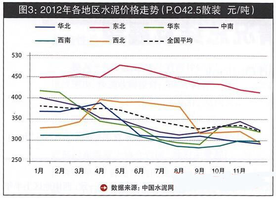 商品混凝土價格主要取決于成本方的水泥價格及需求情況,2012年全國水泥價格呈現(xiàn)前高后低的"U"型走勢,東北地區(qū)價格保持在全國最高位運行,西南成為全國水泥價格凹地。