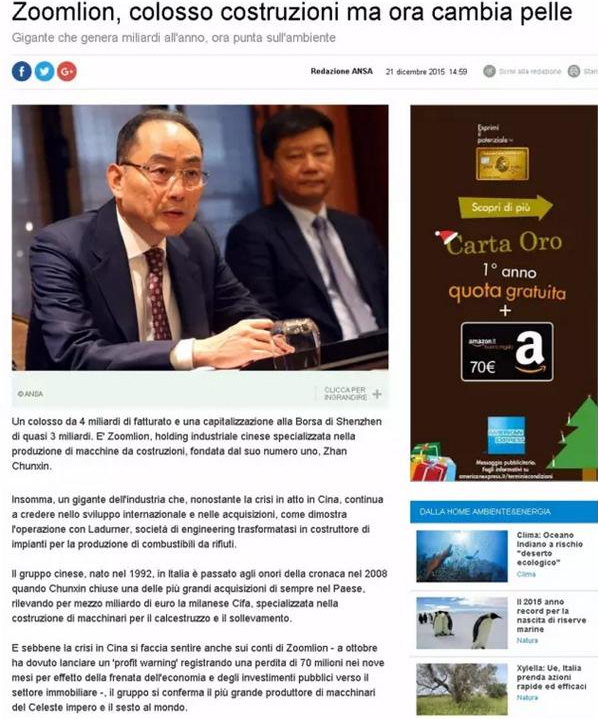 意大利知名國際通訊社安莎通訊社(Agenzia nazionalestampa associata,ANSA)今日在其網(wǎng)站首頁連續(xù)重磅發(fā)布三篇報道,聚焦中國企業(yè)中聯(lián)重科收購意大利領(lǐng)先環(huán)保企業(yè)LADURNER(納都勒)公司,中聯(lián)重科董事長詹純新,公司副總裁、環(huán)境集團(tuán)總裁張建國接受了安莎社記者的專訪。