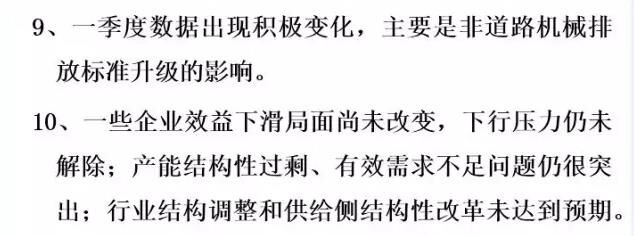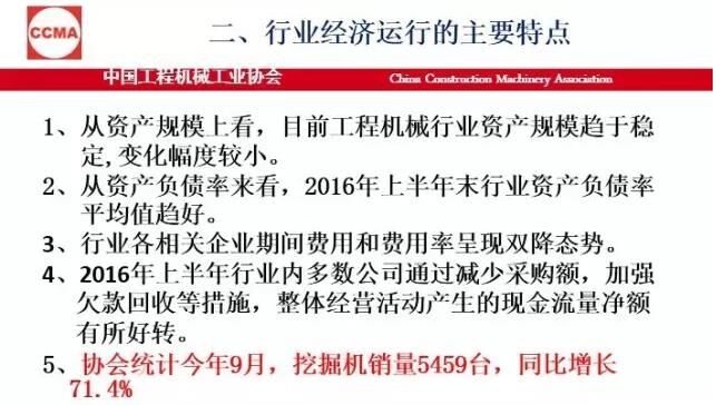 我個人總結(jié),今年的運行情況有這樣十個方面。第一,從整個全行業(yè)各企業(yè)的資產(chǎn)規(guī)模上看,目前趨于穩(wěn)定,變化幅度很小,不像前兩年振動那么大。第二,從資產(chǎn)負債率來說,現(xiàn)在負債率是在60%左右,全國的工業(yè)企業(yè)是56%。所以,這個行業(yè)的資產(chǎn)負債率目前看也是很好的。這個需要引起大家的關(guān)注和分析,我們也希望后幾個月情況可以穩(wěn)定向好。還有自主品牌市場占有率,在國內(nèi)市場還是保持高位,從全行業(yè)來看在90%以上。那么,產(chǎn)業(yè)的集中度又進一步地增強了,但有一些企業(yè)挺無助的,出局了,進口額下降。今年按照環(huán)保部5號令,全行業(yè)工程機械產(chǎn)品實現(xiàn)了新的標準升級。整個產(chǎn)品進行了更新?lián)Q代,這個非常難能可貴。最后是產(chǎn)能結(jié)構(gòu)性過剩,有效需求不足問題仍然突出,行業(yè)結(jié)構(gòu)調(diào)整還有供給側(cè)結(jié)構(gòu)改革遠遠沒有達到預期。即便是按照現(xiàn)在的挖掘機銷量5500多臺,就算是6000臺,產(chǎn)能又有多少?一旦市場回暖,一些企業(yè)家還是會頭腦一熱,這樣大一個產(chǎn)能釋放出來的產(chǎn)量是什么局面?我們必須保持一個清醒的頭腦。